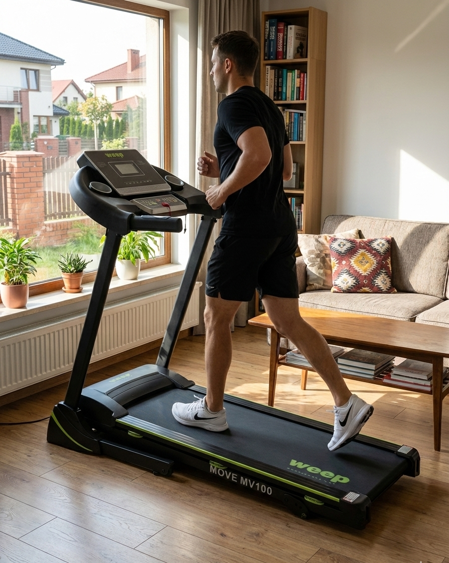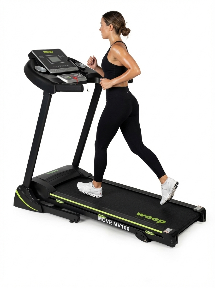 Weep Move MV100 to nowoczesna, solidna bieżnia elektryczna przeznaczona do treningu domowego. Łączy funkcję składania, regulowane nachylenie oraz skuteczny system amortyzacji, zapewniając komfortowy i bezpieczny trening niezależnie od poziomu zaawansowania użytkownika.