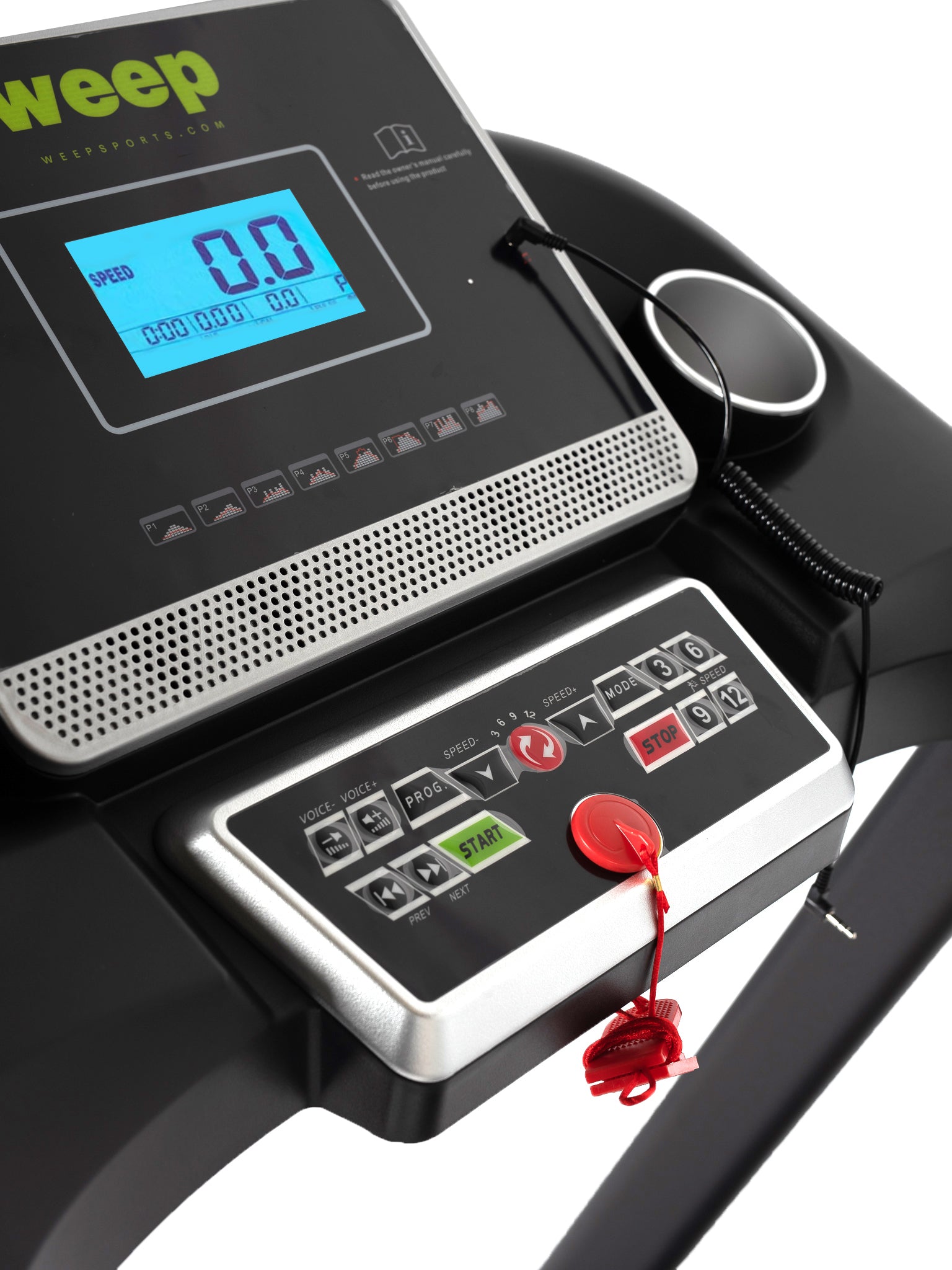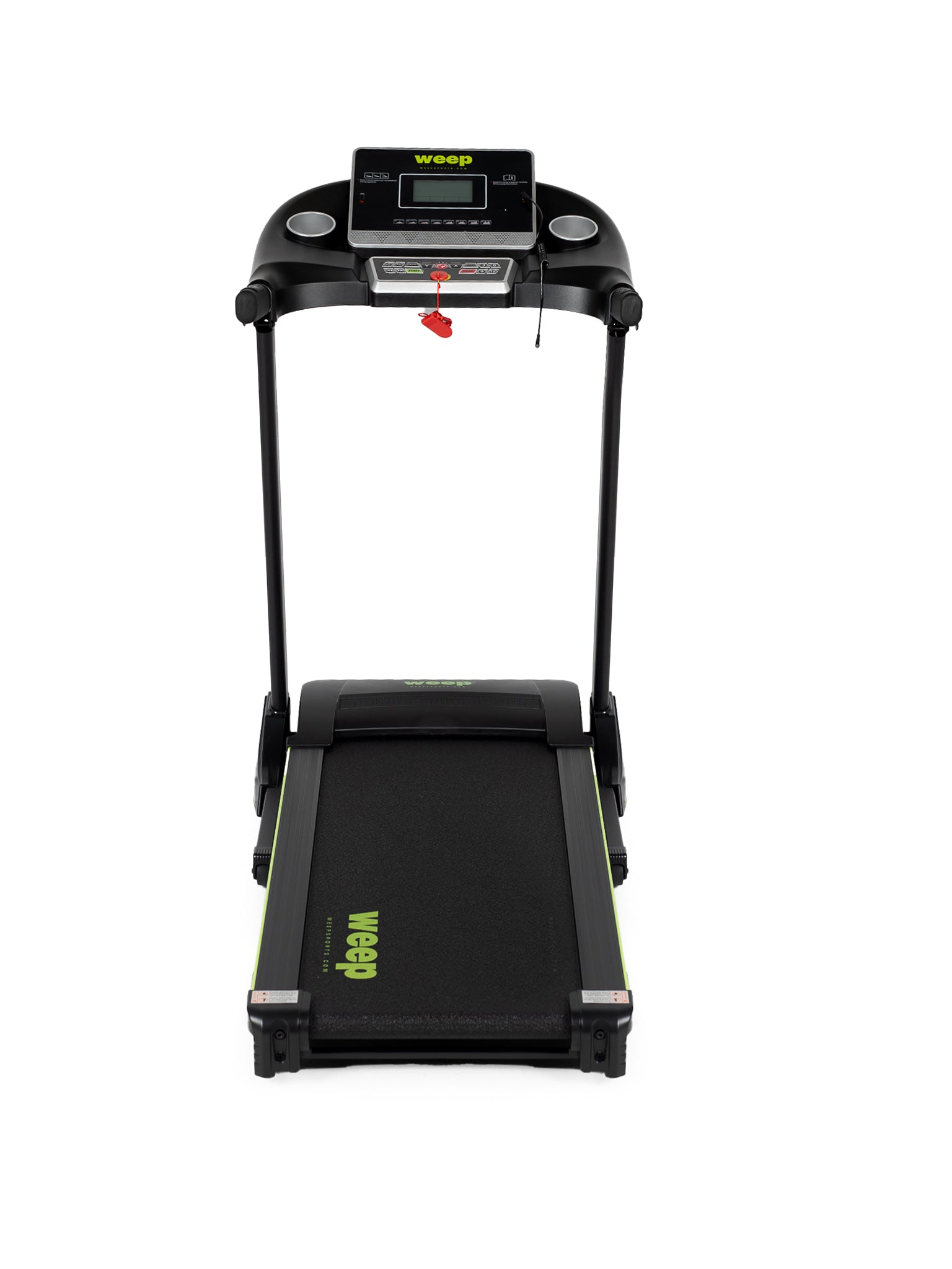 Antypoślizgowy, wielowarstwowy pas biegowy zapewnia dobrą przyczepność i stabilność kroku, a klucz bezpieczeństwa umożliwia natychmiastowe zatrzymanie urządzenia w sytuacji awaryjnej.
