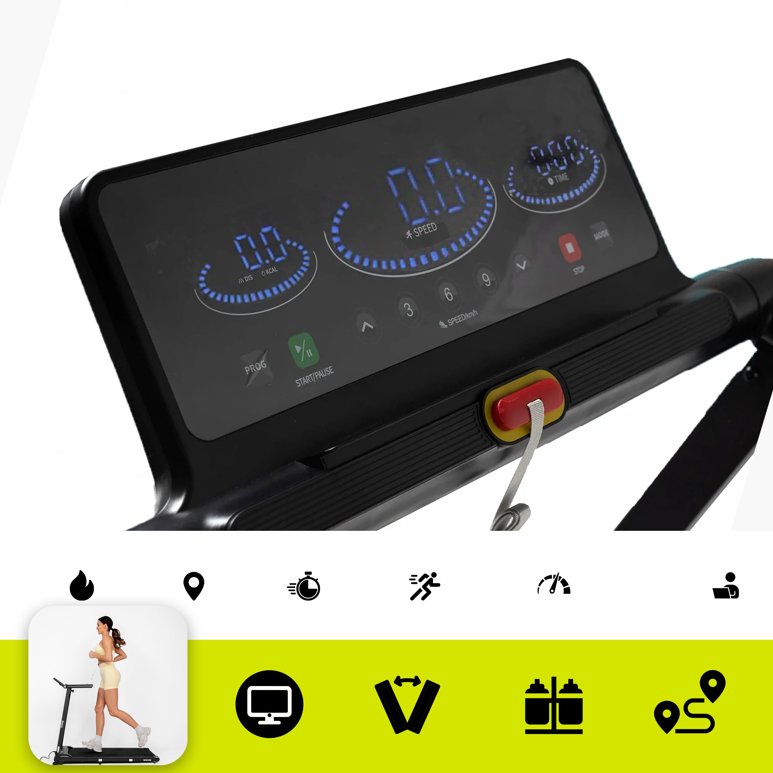 Antypoślizgowy, wielowarstwowy pas biegowy zapewnia dobrą przyczepność, a kluczyk bezpieczeństwa pozwala na natychmiastowe zatrzymanie urządzenia w sytuacji awaryjnej.