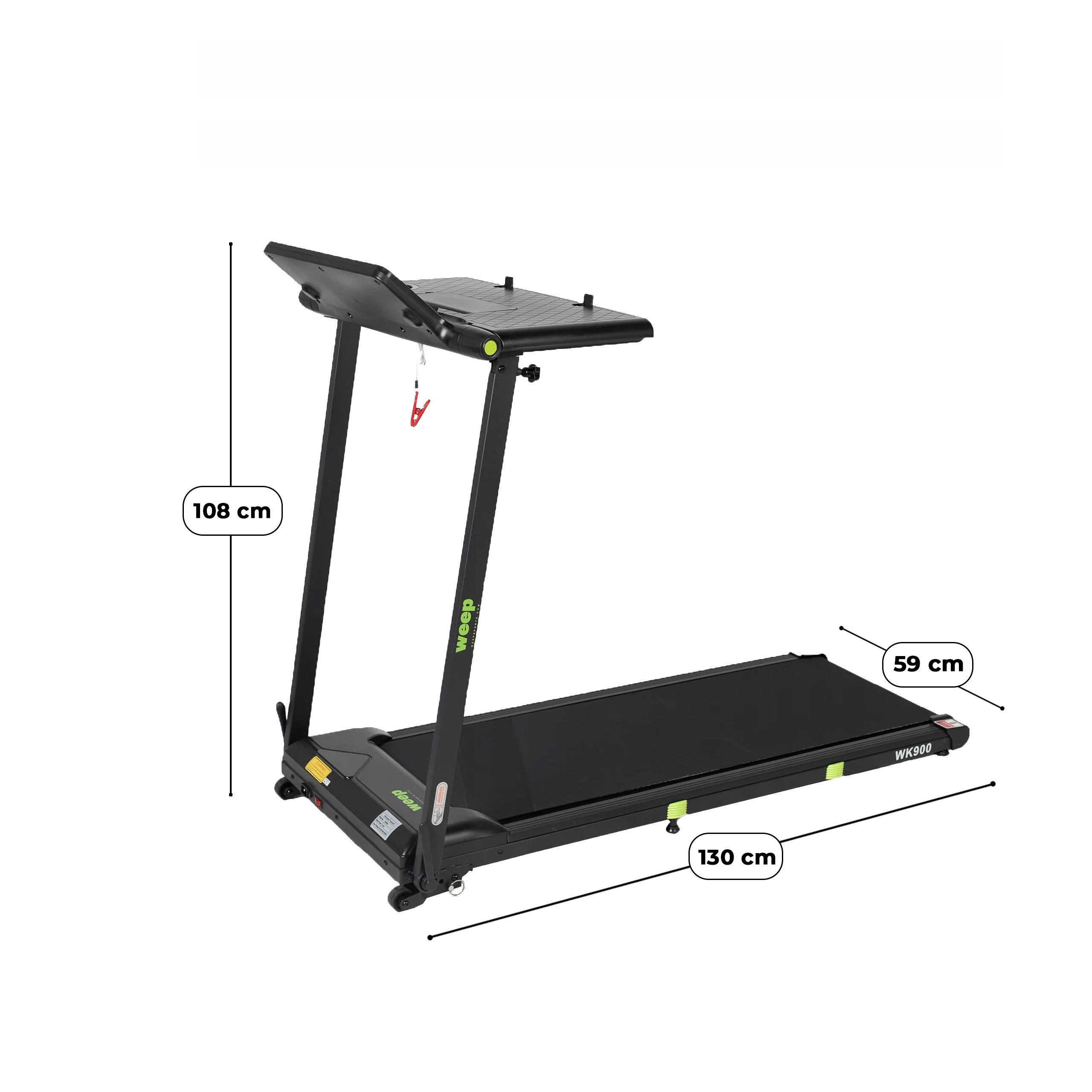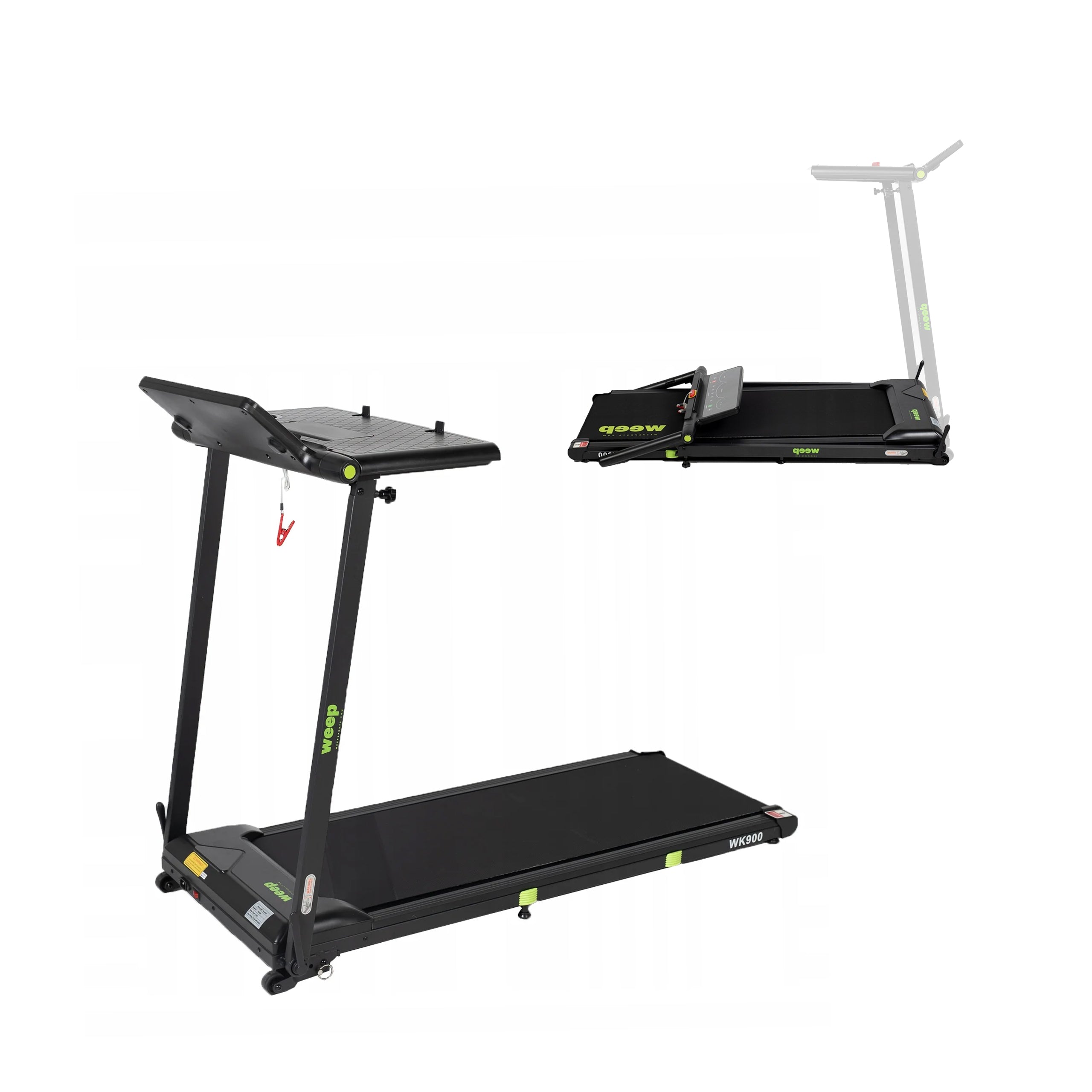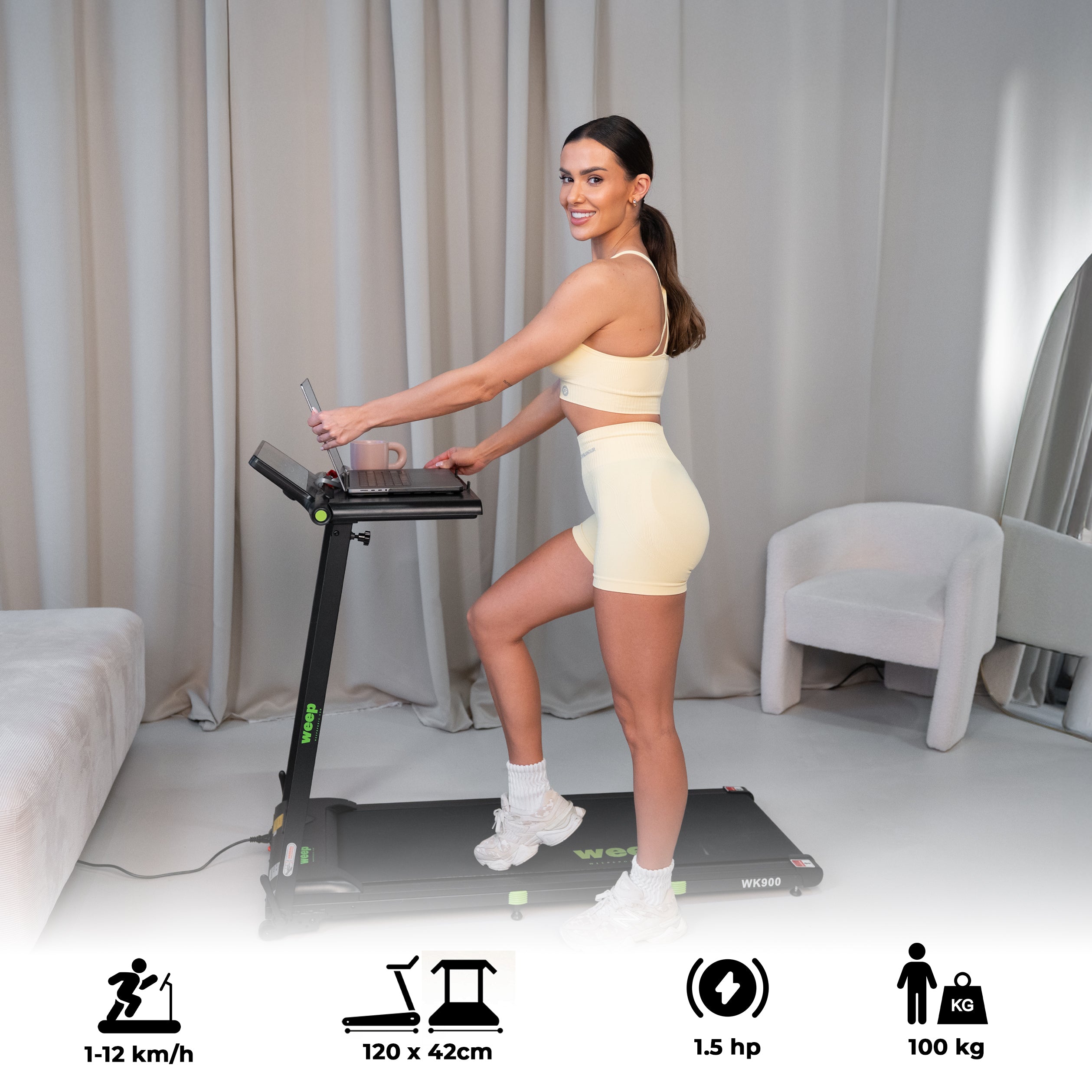 Weep Work WK900 to funkcjonalna bieżnia elektryczna zaprojektowana z myślą o domu i biurze. Wyposażona w praktyczny blat na laptop, umożliwia aktywną pracę w ruchu. Stabilna konstrukcja, skuteczny system amortyzacji oraz funkcja składania zapewniają komfortowy i bezpieczny marsz lub bieg podczas codziennej aktywności.