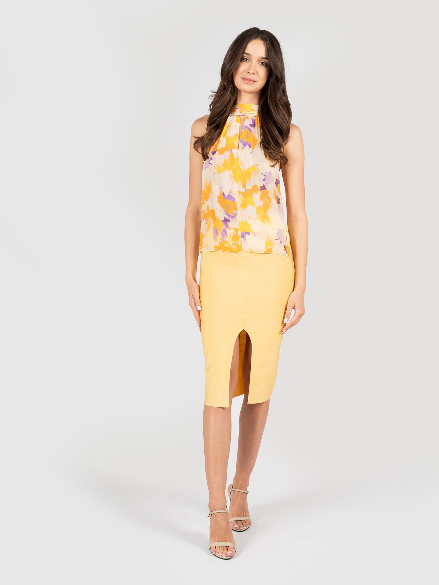 Z rozcięciem na wysokości dekoltu z przodu, które dodaje delikatnego uroku i pozwala na subtelne odsłonięcie skóry, co jest doskonałym sposobem na wprowadzenie odrobiny zmysłowości do Twojej stylizacji.