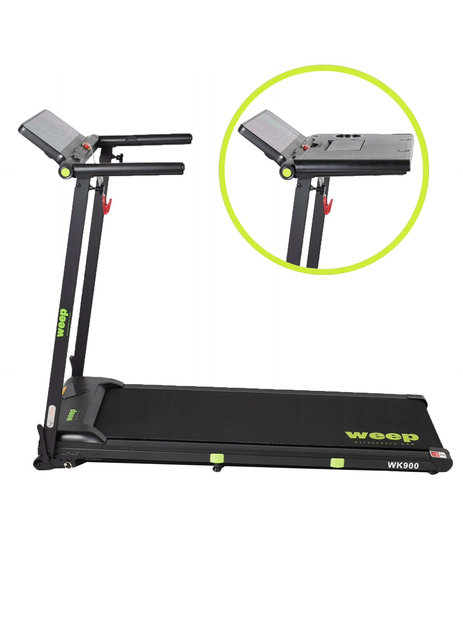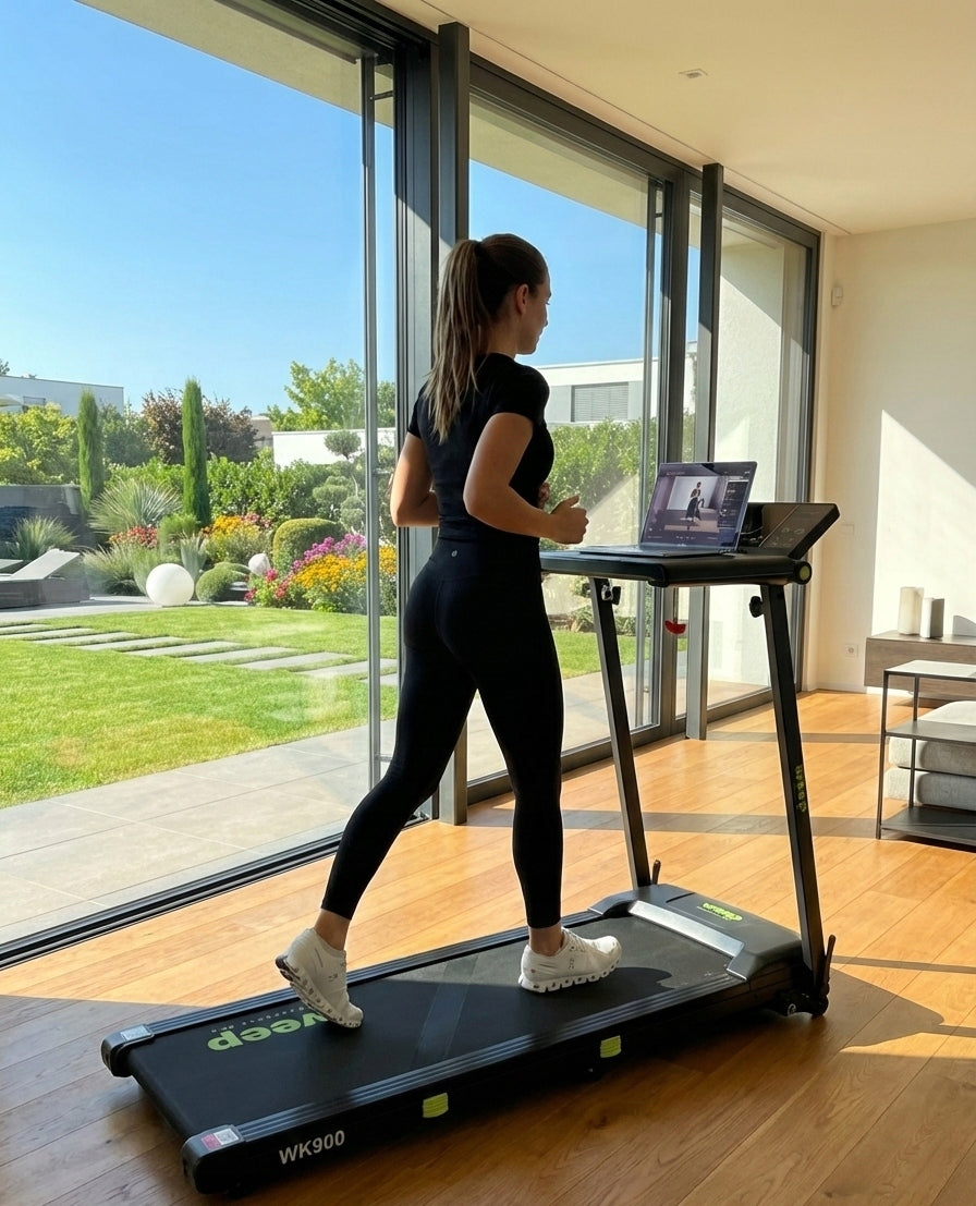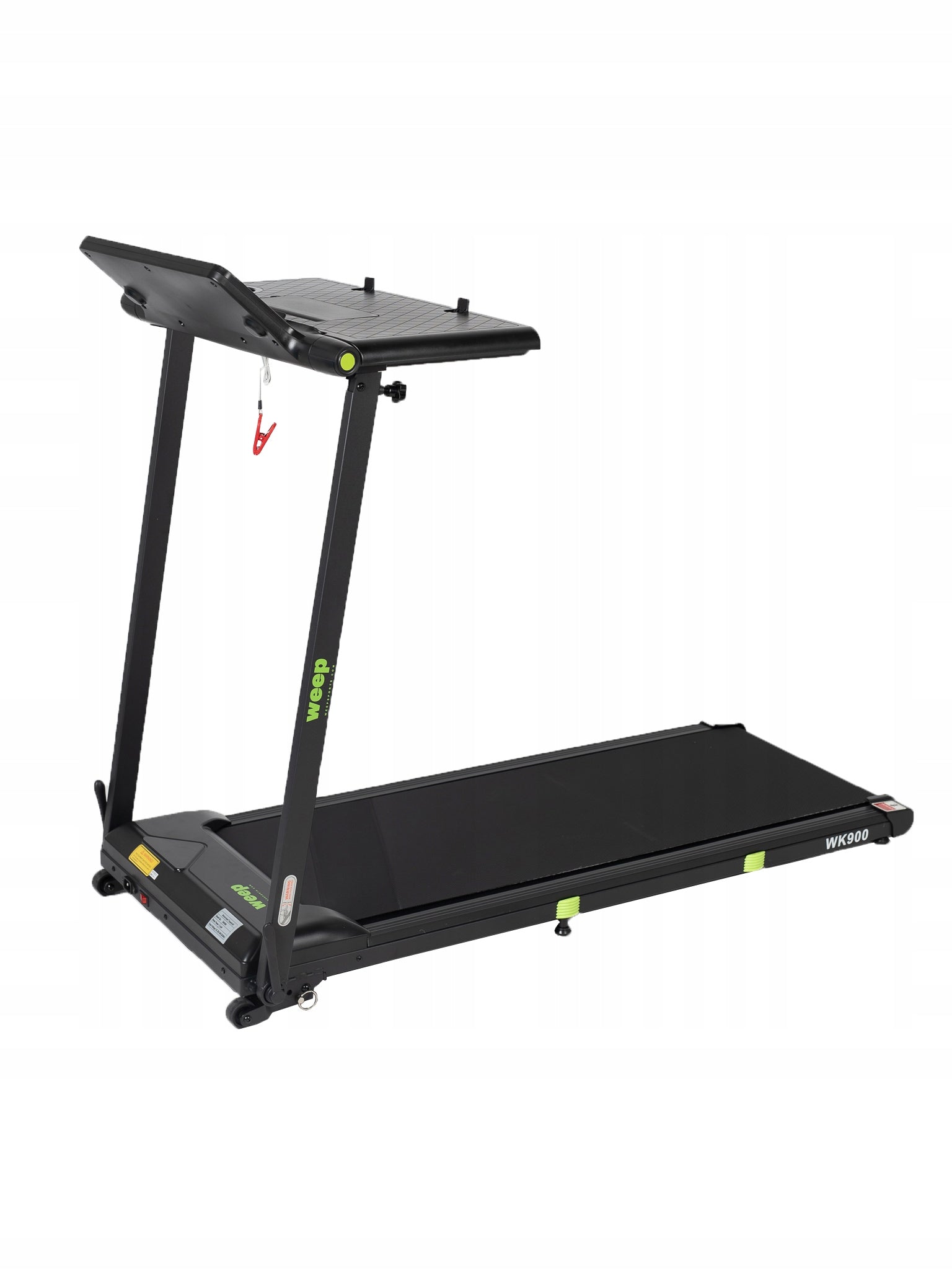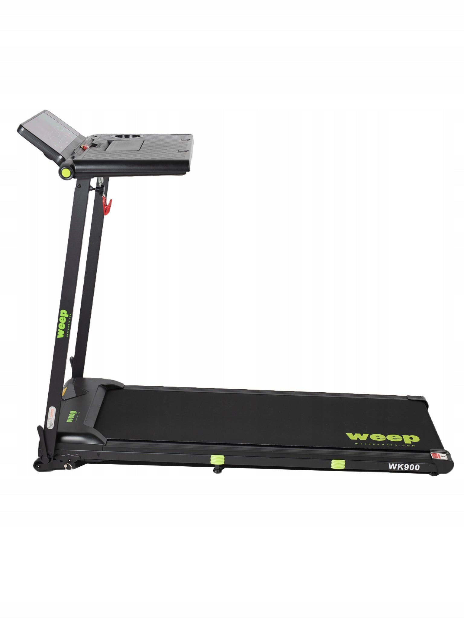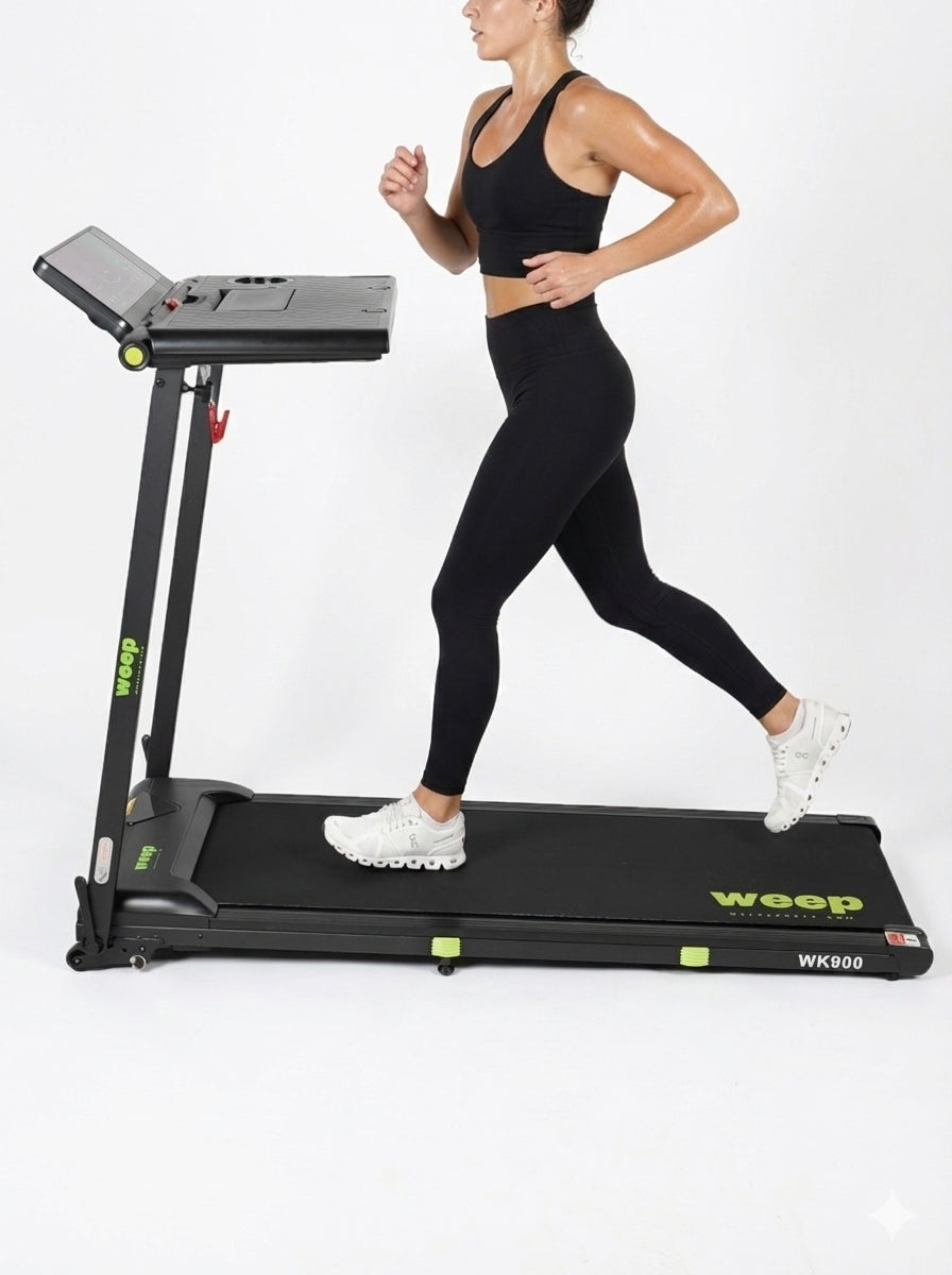 Weep Work WK900 to funkcjonalna bieżnia elektryczna zaprojektowana z myślą o domu i biurze. Wyposażona w praktyczny blat na laptop, umożliwia aktywną pracę w ruchu. Stabilna konstrukcja, skuteczny system amortyzacji oraz funkcja składania zapewniają komfortowy i bezpieczny marsz lub bieg podczas codziennej aktywności.